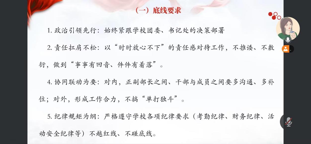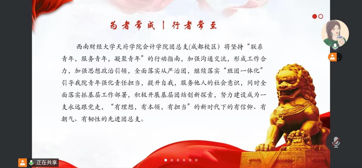 2025年11月5日19点,会计学院团总支(成都校区)在腾讯会议召开本学期第二次全体例会。本次会议围绕总结近期工作、明确发展方向、强化团队建设、提升工作效能展开,通过团歌齐唱、干部任命公布、书记处部署、指导老师寄语四个环节,为团总支后续工作筑牢基础。