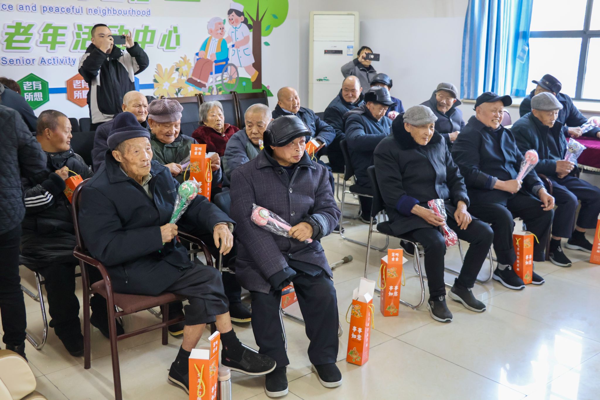 活动现场处处涌动着温情,同学们默契分工,把关怀融入每个细节。文艺互动环节,同学们带来精心准备的节目,经典老歌一响起,长辈们便跟着轻轻哼唱,趣味小品逗得全场开怀大笑;表演间隙,大家主动凑近老人,有的陪老人跟着旋律拍手打节奏,有的蹲在老人身边,认真倾听他们分享与歌曲相关的过往回忆,养护楼里满是欢声笑语。礼品赠送环节,同学们双手捧着实用礼品递到老人手中,并握着老人的手唠起家常,还轻声叮嘱“天冷记得添衣”“走路慢些小心”,暖心话语直抵人心;大家耐心坐在老人身边,听他们讲述过去的经历,用陪伴驱散冬日的寒冷,让温暖在彼此心间慢慢流转。活动尾声,全体人员围在一起合影,定格下满是笑容的温馨瞬间。