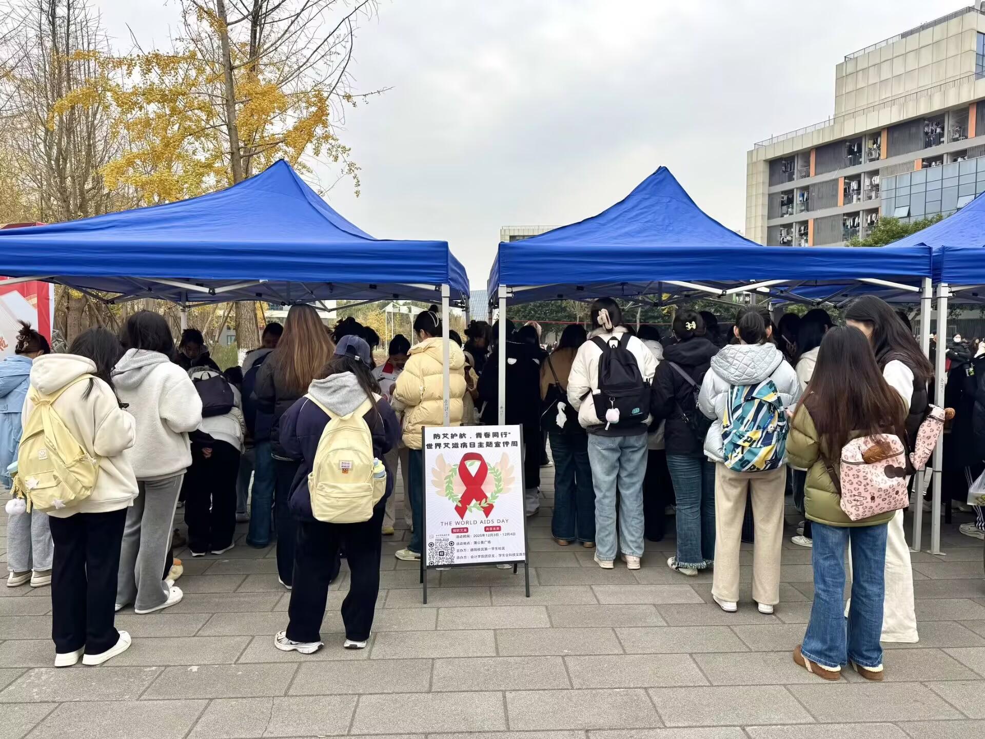 为进一步普及艾滋病防治知识,增强青年学生的自我保护意识与社会责任感,营造健康、平等、包容的校园氛围,2025年12月3日至4日,德阳校区第一学生社区在蒲公英广场成功举办“防艾护航,青春同行”世界艾滋病主题宣传周活动。本次活动以多元互动形式为载体,引导学生正确认识艾滋病,传递尊重与关爱的理念,共同为构建健康包容的校园与社会贡献力量。
