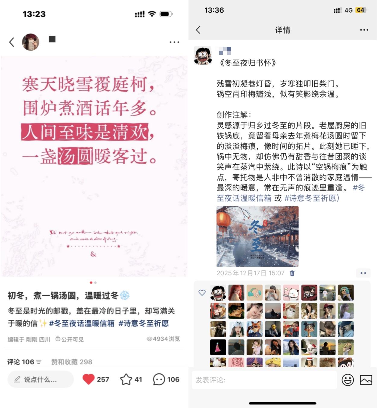 活动采用“诗词+音频”双赛道形式,参与者选择小红书、抖音、朋友圈任一平台,发布原创冬至诗或温情祝福,并携话题#冬至夜话温暖信箱#,让内容汇流。同学们以“冬至一阳生”“雪落安知春意深”等为题,将节气物候、家国情怀写进字里行间;当指尖敲击键盘取代围炉夜话,屏幕里的诗句与声音同样升腾起滚烫的暖意。为确保文化深度与趣味性并存,主办方提前在群内推送“冬至知识卡”,涵盖“冬至祭天”“数九消寒”等民俗小知识;同时设置“点赞转发换时长”激励机制,极大激发了同学们的创作与传播热情。冬至已至,春日不远,愿所有“云端投递”的思念与祝福,都在不久的将来迎来繁花回音。