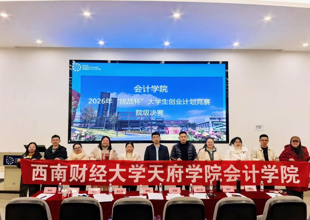 为深入贯彻国家创新创业教育精神,激发青年学子创新热情与实践能力,西南财经大学天府学院会计学院2026年“挑战杯”大学生创业计划竞赛院级决赛于2026年1月7日15:00在B301报告厅顺利举办。本次决赛特邀成都市产业导师、四川省低空经济协会(筹)产业创新部部长、教育部高等职业学校办学能力评价评估专家瞿刚,会计学院分党委副书记(主持工作)孟仁丹,会计学院分党委副书记夏丹,会计学院副院长张娟,会计学院学生竞赛中心主任张晓华,西南财经大学天府学院黄兴睿创新工作室领办人黄兴睿,国创赛优秀指导教师杨卓,挑战杯优秀指导老师姚兰,国创赛优秀指导教师曾帅出席。从167件初赛作品中脱颖而出的20支优秀团队同台竞技,展现了新时代大学生的创新思维与责任担当。