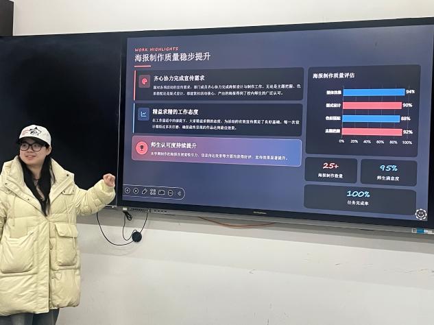 会议中,吴尚帅薇首先肯定了团队本学期工作,并鼓励成员在服务竞赛的同时积极参与竞赛,以熟悉流程、提升工作质量。随后,文件组负责人卢睿妍表示组内工作积极性和完成质量均有提高。接着,宣传组负责人葛春景肯定了组内宣传海报的制作水平。会议最后,全体成员合影留念。