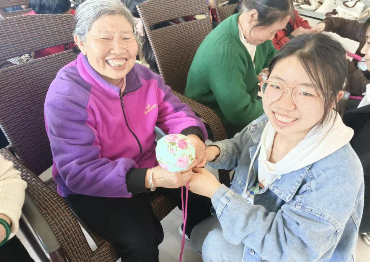 志愿者同老人一起制作艾草养生锤