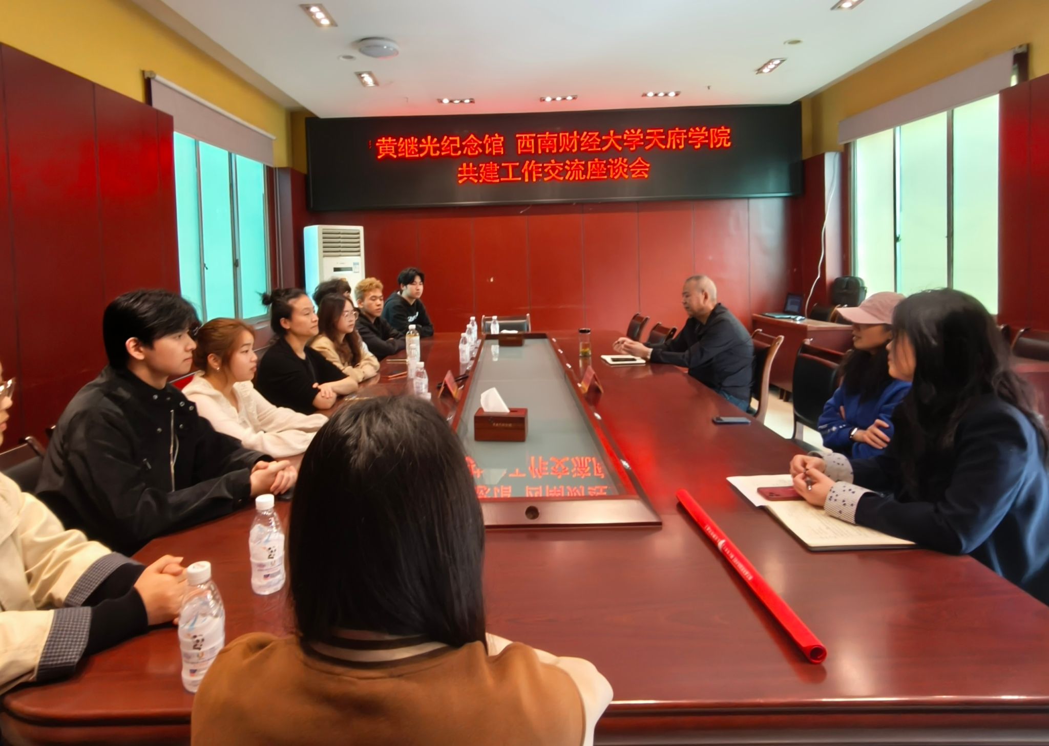 参观结束后,师生一行与黄继光烈士亲属、纪念馆工作人员进行了深入交流与探讨。座谈会上,师生们就舞台剧的叙事结构、历史细节的真实还原、英雄形象的艺术塑造以及如何更好地引发当代青年共鸣等问题,向三位馆长虚心请教。三位馆长结合翔实的史料和多年的研究心得,逐一回应了师生们的疑问,并就剧本创作中的关键情节、时代背景、人物心理等方面提出了宝贵的指导意见。