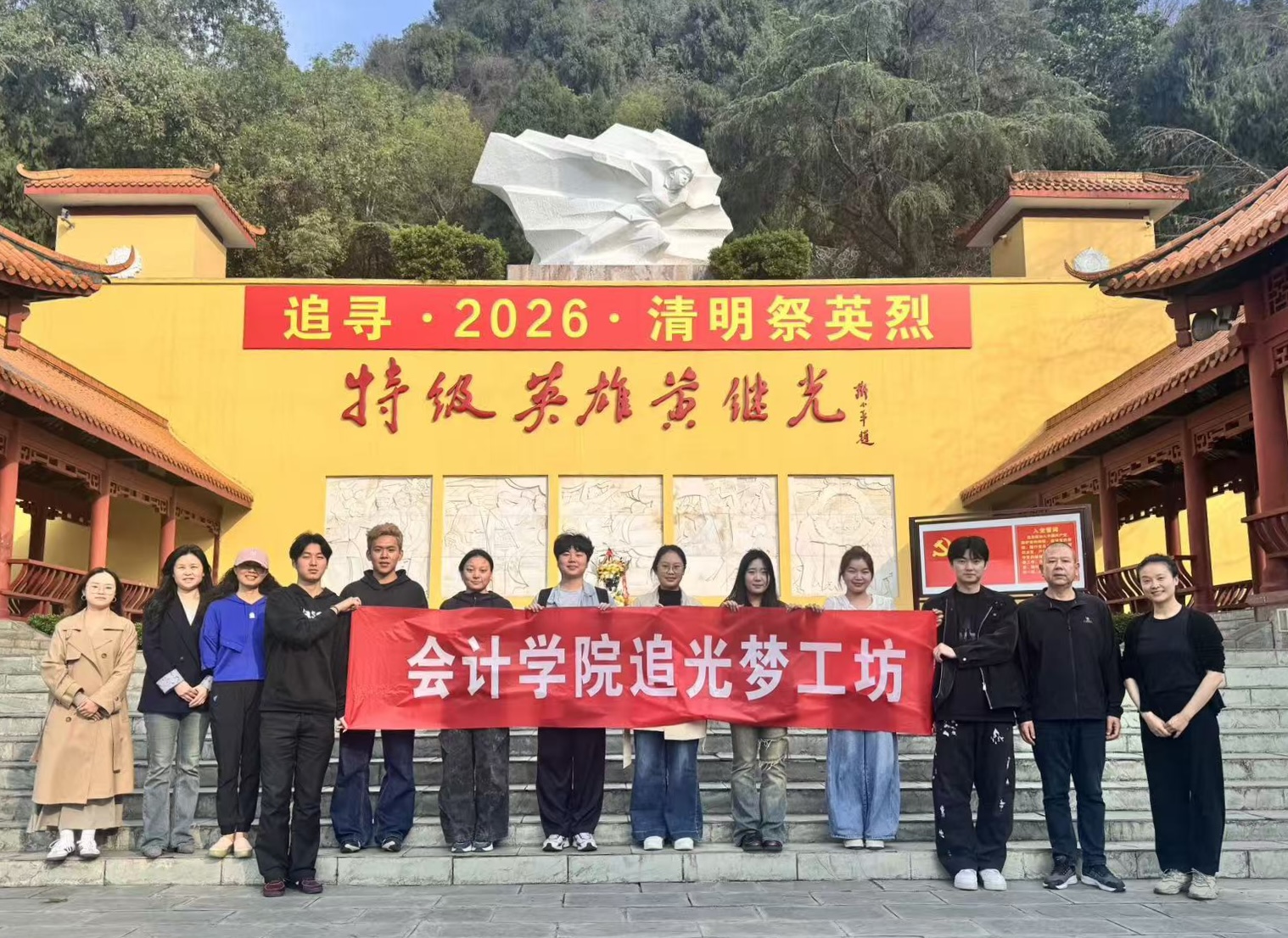 为深入挖掘英雄精神内涵,以艺术形式讲好红色故事,2026年4月8日下午,西南财经大学天府学院德阳校区第一学生社区组织师生一行,前往中江黄继光纪念馆,开展了一场以“致敬特级英雄,铸魂舞台艺术”为主题的艺术采风活动。