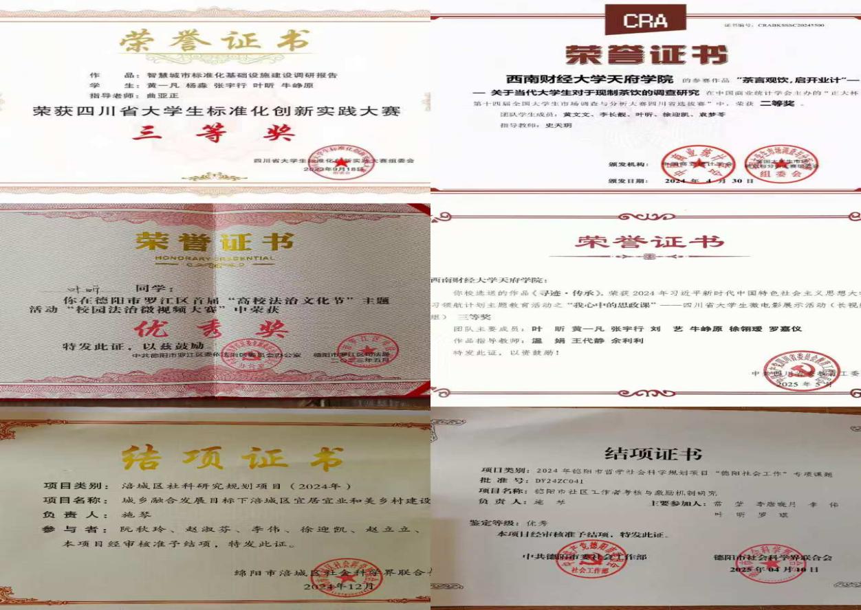 部分获奖证书