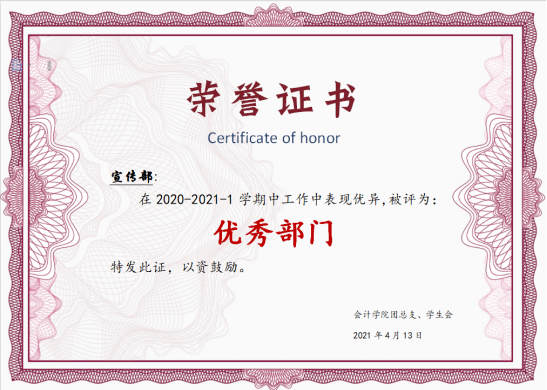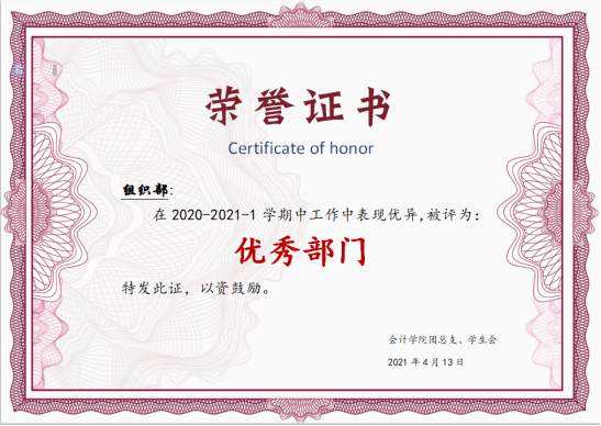 2021年4月12日中午,会计学院团总支、学生会在教室D301召开了2020-2021-1学期表彰大会,总结上学期工作,表彰先进部门,共同促进团学的发展。本次会议由团总支副书记余蕾主持,团学指导老师何开纪、刘洋和所有干部共同参加。