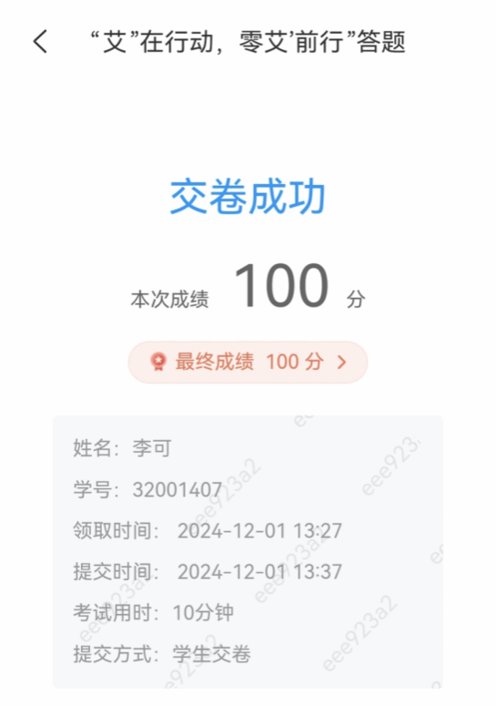 此次线上答题活动,不仅检验了学校在防艾宣传教育方面的工作成果,也进一步提高了各位同学对艾滋病防治知识的知晓率和自我防护意识。通过以答促学、以问促行的方式,有效激发了学生主动学习防艾知识的积极性,使预防艾滋病的理念更加深入人心。未来将继续加大艾滋病防治宣传教育工作力度,创新活动形式,丰富活动内容,持续提升学生的健康素养,为学生的健康成长保驾护航,努力营造一个安全、健康、和谐的校园环境。