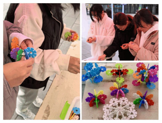 此外,同学们还沉浸在对童年美好时光的怀念中,利用那些曾经给予他们无数欢乐与梦想的雪花片来拼搭各种创意造型。雪花片如同一把钥匙,打开了同学们对美好生活无限向往的大门,寄托着他们对未来生活的美好憧憬与热切期待。