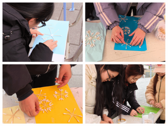 同学们纷纷动手,发挥创意,用棉花棒拼出了各式各样的雪花图案。每一根细小的棉花棒都被巧妙地运用,模拟出雪花那错落有致、晶莹剔透的六边形分支,它们或繁复交织,或简约雅致,无不展现出自然界的鬼斧神工。