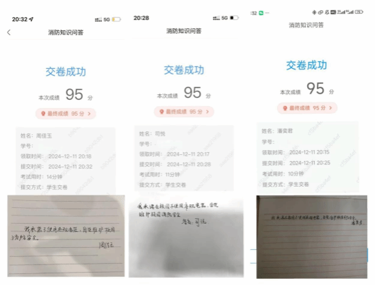 同时,一场别开生面的消防知识问答在线上的学习通平台悄然上线。考察范围全面而又深入,涵盖多方面消防安全知识。问答合格后,同学们纷纷通过平台上传手写的安全承诺标语,承诺严格遵守消防安全规定,积极传播消防安全理念,为创建一个更加安全的学习和生活环境贡献自己的力量,也起到了相互激励和监督的作用。
