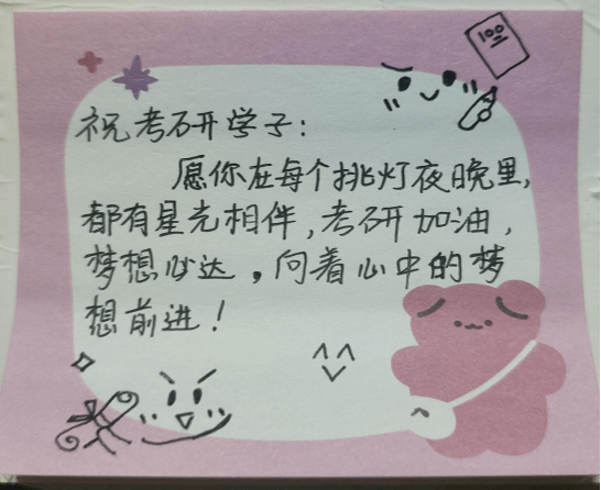 活动举办之际,便得到了同学们的积极响应。大家纷纷拿起笔,对将要参加考研的学子给予鼓励、期许与祝福都倾注于纸上。这些手写的祝福语各具特色,有的字迹刚劲有力,一笔一划都彰显着对考研学子坚韧毅力的肯定与信任,如 “考研之路,荆棘满布,然君之坚毅,定能破竹前行,凯旋而归”;有的笔触细腻娟秀,字里行间满是温情关怀,“愿你在每一个挑灯夜读的时刻,都有星光相伴,考研加油,梦想必达”;还有的用创意的绘画与文字相结合,绘制出精美的励志图案,旁边配上 “循此苦旅,终抵繁星,考研上岸,未来可期” 的话语,为祝福语增添了别样的色彩。