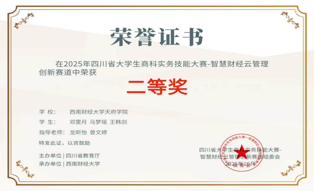 【喜报】西南财经大学天府学院学子在“2025年四川省大学生商科实务技能大赛智慧财经云管理创新赛道”荣获佳绩