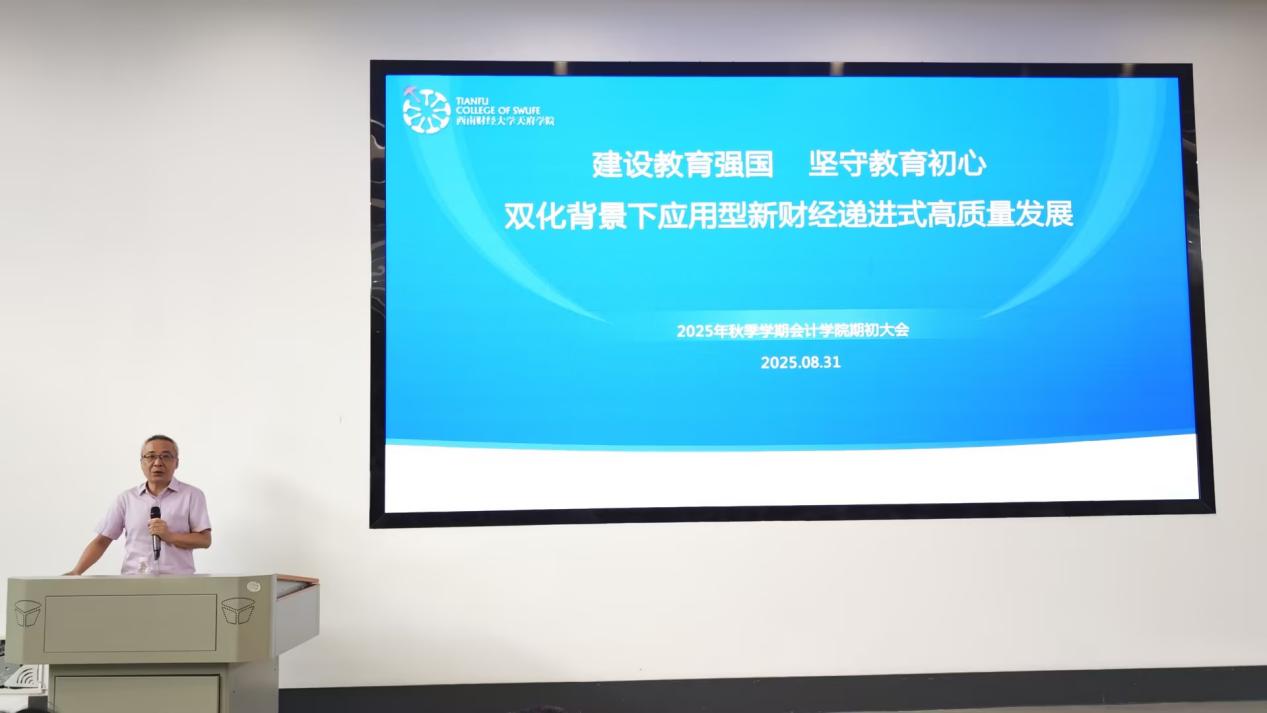 8月31日上午,会计学院在德阳校区B301报告厅召开全体教职工期初工作会议。西南财经大学天府学院副校长张之明、校长助理高亮参会,四川省经济学与财政学教学指导委员会秘书长、西南财经大学财税学院刘蓉教授受邀出席,会计学院院长陈真子主持会议。会议围绕“建设教育强国,坚守教育初心,双化背景下应用型新财经递进式高质量发展”主题,讨论人工智能背景下的教育变革和学院发展,总结2024-2025学年工作成果,规划新学年工作重点。