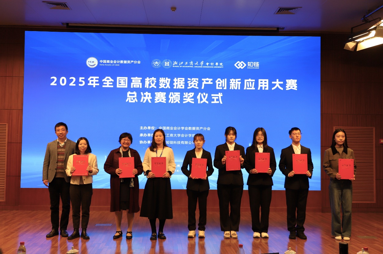 论坛尾声,还举行了第一届全国高校数据资产创新应用大赛颁奖典礼,表彰在数据资产创新应用领域表现突出的高校团队。我院师生获本科组、高职组及优秀指导教师共三个奖项。