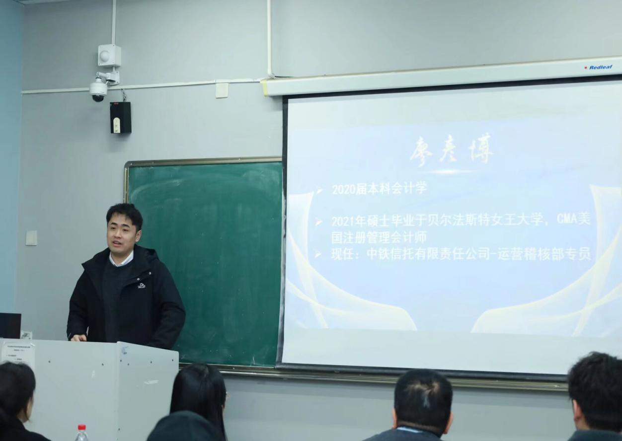 在校友分享环节,2020届会计专业校友、中铁信托有限责任公司从业者廖彦博首先登台发言,分享了其在留学、求职及职场中的成长经历。他提醒学弟学妹“先选对赛道,再全力加速”;并直言“CPA不是万能钥匙,却是行业敲门砖”,在信托、券商、基金,CPA可以不会立刻让你升一级,但会决定你十年后还在不在这条赛道上。
