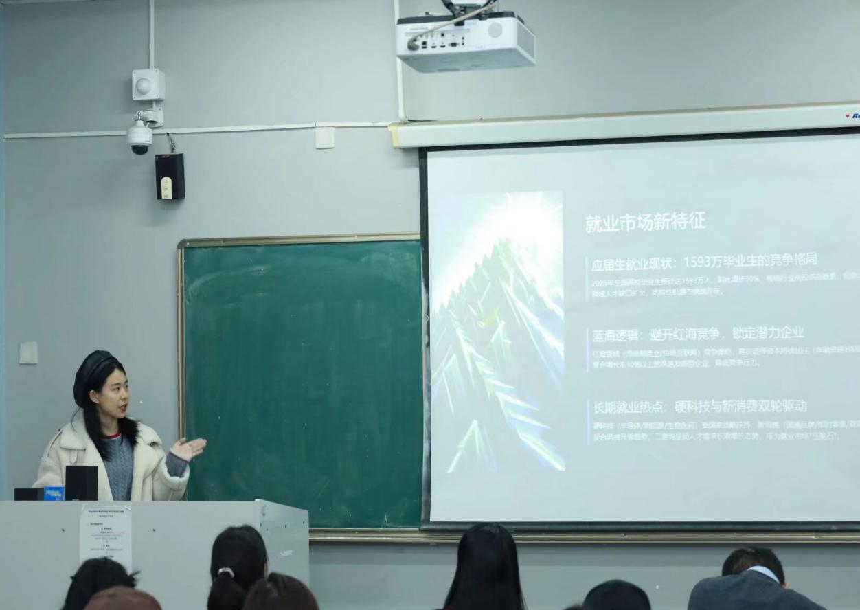 第三位分享的校友来自2017届会计专业、现就职于中国电子科技集团成都天奥技术发展有限公司的任倩,她用“资本流向图”提醒“跟着钱找蓝海”;并现场进行了会计六大热门行业就业方向的解析,建议“先选赛道再投岗位,把简历写在产业风口上”。