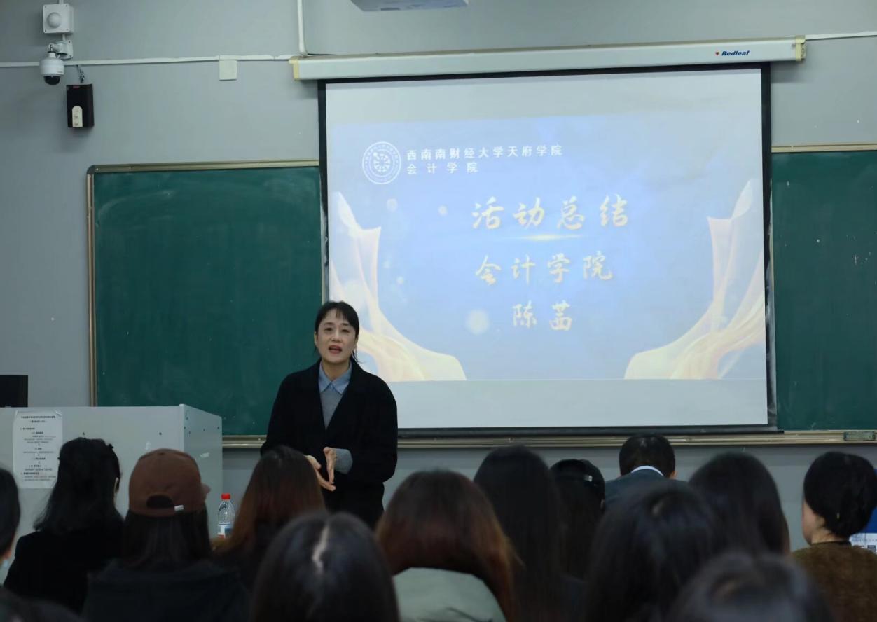 会议尾声,会计学院副院长陈茜对本次校友交流会进行总结。她对三位校友的倾囊相授和全体师生的积极参与表示感谢,希望同学们能从校友的分享中汲取智慧,提炼关键经验,以自信自律的态度面对职场挑战。她强调,时代虽在变化,但扎实的专业能力、持续学习的意识以及踏实肯干的作风,始终是职业发展的不变基石,鼓励同学们明确目标、稳步前行,顺利开启职业生涯新篇章。