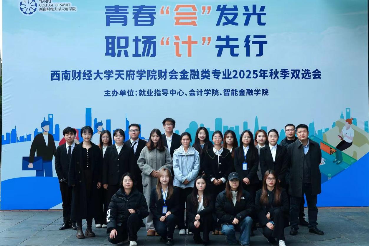 为抢抓2026届毕业生秋季求职关键期,精准护航会计学子求职之路,11月25日下午,就业指导中心、会计学院和金融学院联合举办的“青春‘会’发光,职场‘计’先行”西南财经大学天府学院财会金融类专业秋季双选会在成都校区(西区)1 号楼一楼大厅火热启幕。来自成渝地区的27家优质用人单位进校揽才,其中会计学院邀请17家“新老朋友”企业组团而来,岗位需求覆盖会计核算、审计鉴证、税务筹划、财务助理等岗位。