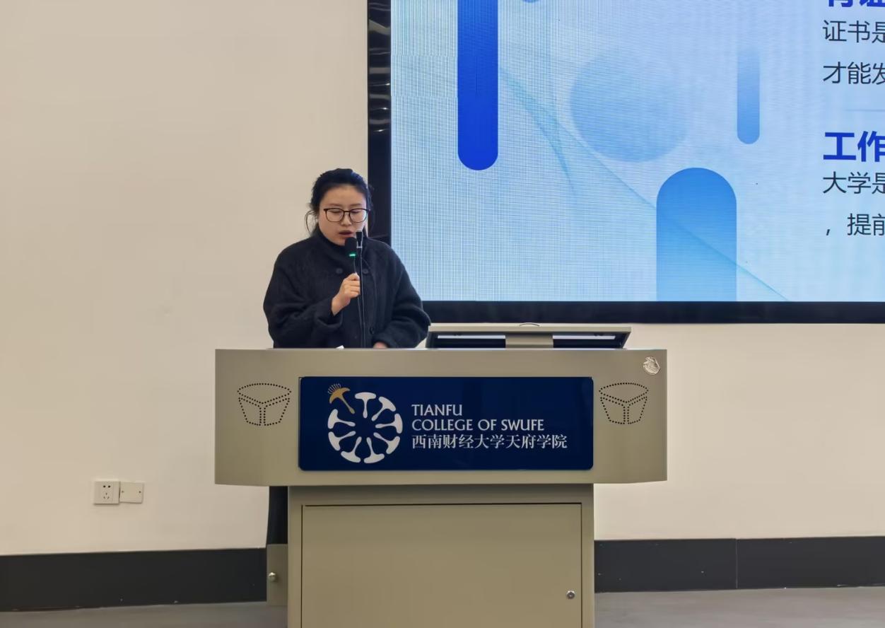 帮助学生理清证书备考思路,高效规划技能提升路径,2025年12月9日晚,由会计学院班主任秘书处联合团总支、学生会学术部共同举办的“班主任领航系列”讲座在德阳校区B101报告厅顺利开展。本次讲座以“技能证书规划攻略”为主题,特邀会计学院2024级专大数据会计14班班主任、会计系教师魏韦华担任主讲,德阳校区大一至大三约240名学生积极参与。