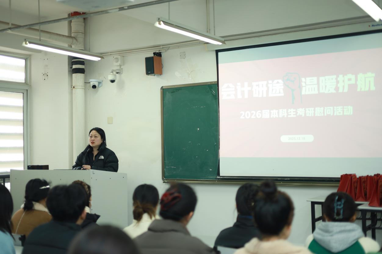 为鼓舞考研学子斗志,传递学院温情关怀,2025年12月18日,西南财经大学天府学院会计学院在成都西区1-503教室举行“会计研途·温暖护航”2026届本科生考研慰问活动。会计学院院长陈真子携毕业班辅导员团队,为50名奋战在冲刺阶段的考研学生代表送上暖心礼包与真挚祝福,用“天府温度”点燃“研途星火”。