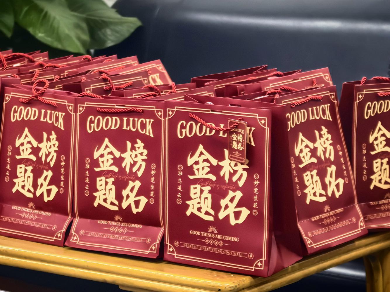 随后,陈院长率毕业班辅导员团队移步学子中间,将“金榜题名”暖心礼包逐一递到同学手中,并与同学们亲切交流,细询复习节奏与生活冷暖,勉励大家稳住心态、校准作息,以最佳状态迎接周末的研考决战。礼包以“金榜题名”红色手提袋盛装,内置“0.5mm黑色战笔”“前程似锦车线本”“未来可期便利贴”“一帆风顺套尺”和“心想事成贴纸包”。每一份礼包既具实用之便,又载深情之托,化作会计学院最炽热的“研途星灯”。
