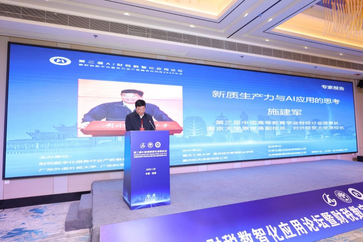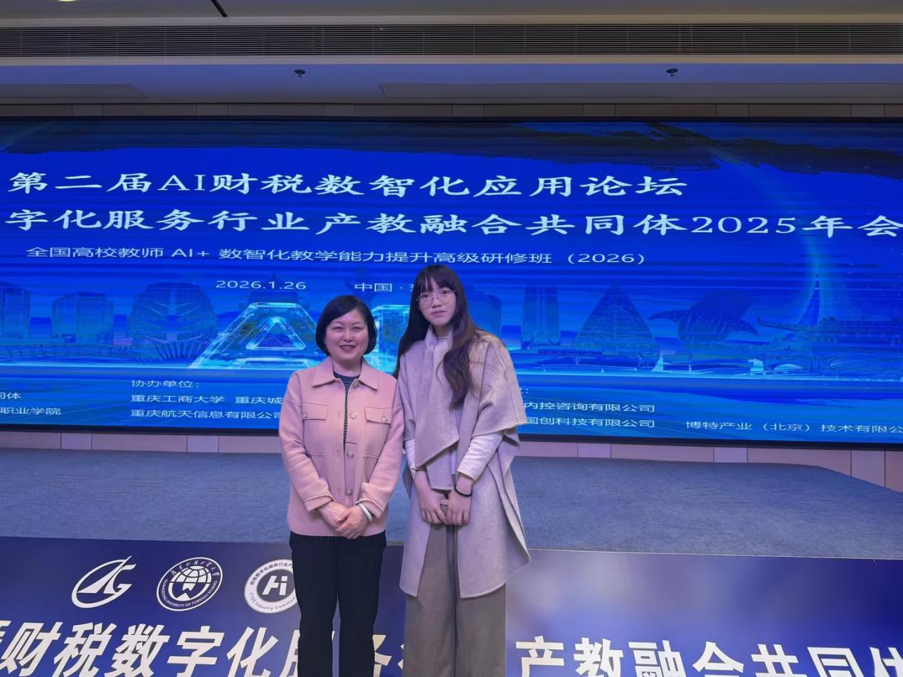 2026 年 1 月 25 日至 26日,由财税数字化服务行业产教融合共同体、广东外语外贸大学、广东科学技术职业学院联合主办的 “第二届 AI 财税数智化应用论坛、财税数字化服务行业产教融合共同体 2025 年会暨全国高校教师‘AI+’数智化教学能力提升高级研修班” 在珠海举办。本次盛会汇聚了全国高校、行业企业、科研机构的数百位专家学者与从业者,聚焦 AI 技术与财税领域的深度融合,搭建了产教协同、学术交流与教学提升的多元平台,会计学院院长陈真子、校企合作办公室主任史天玥受邀参加此次活动。