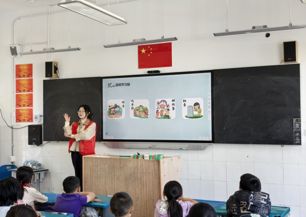 与此同时,会计学院第二党支部组织志愿者走进社区课堂,为青少年带来一堂生动的清明文化课。志愿者以“清明时节雨纷纷”为引,带领同学们穿越回春秋时期,讲述介子推与晋文公的故事,阐释寒食节与清明节的融合演变。同学们积极分享家中吃青团、扫墓祭祖等习俗,在互动中理解清明节既是追思怀远的节日,也是拥抱春天、感受生命力的节气。