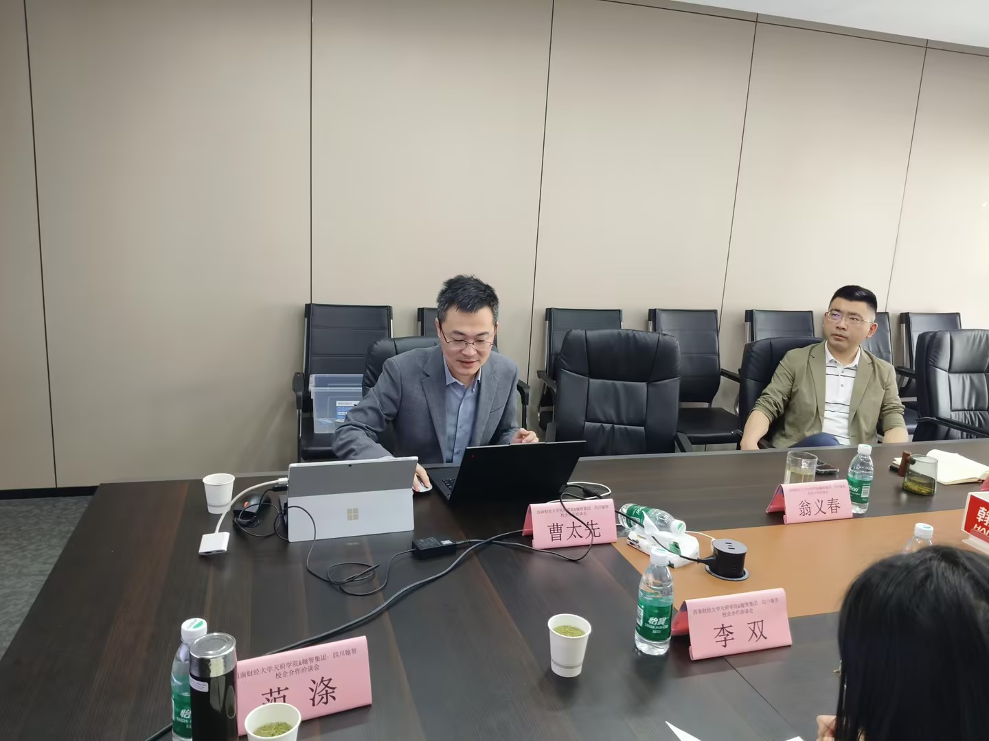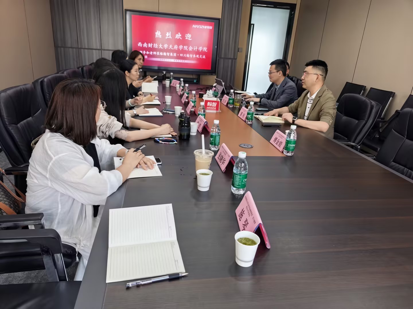 为进一步细化校企合作内容,明确会计专业数智化转型方向,推进数智化课程体系建设,4月24日,西南财经大学天府学院会计学院院长陈真子、副院长许静、财管系主任常莹、会计系副主任李双以及相关课程负责人赴成都翰智中亿数字科技有限公司开展校企合作的深度交流。广东翰智数字科技有限公司副总裁翁义春,四川翰智中亿数字科技有限公司总经理瞿刚,产教融合部经理曹太先出席了本次交流。