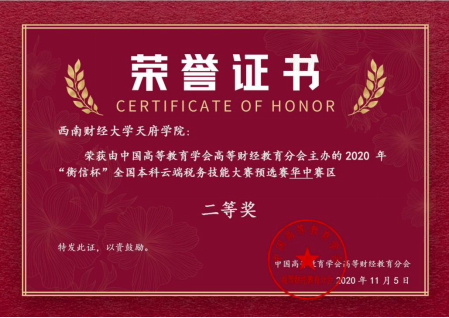 “衡信杯”全国云端税务技能大赛作为具有广泛影响力的传统赛事,在落实疫情防控要求的前提下,依然保持了高水准的办赛质量。本次比赛展现了天府学院学生税务岗位通用技术和职业能力,引领和促进了我校财税教学改革,激发了企业关注和参与税务专业教学改革的主动性和积极性,全面提升了财经职业人才培养的工作水平,也是高校之间的一场友谊赛,相互切磋检验各校的财税人才质量,互相学习互相提升。