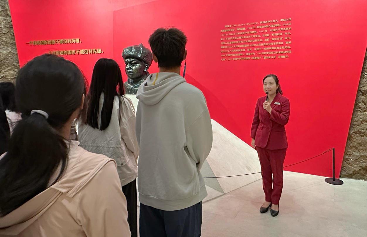 在庄严肃穆的纪念馆内,师生代表们凝神聆听讲解,目光追随着陈列的历史实物与斑驳影像,仿佛穿越时空回到了烽火连天的上甘岭战场。每一件革命文物都以震耳欲聋的沉默诉说着过往,每一帧影像都在重述那场生死抉择。当年轻的目光与历史交汇,两个时代的意志在这一刻碰撞融合——这既是过往的沉淀,更是未来的序章。英雄精神从未在历史中沉睡,始终在觉醒者的血脉里永恒跃动,当讲解至黄继光烈士用血肉之躯堵住枪眼的壮烈一幕时,同学们屏息凝神,眼中闪烁着震撼与敬仰的泪光。文献在静默中咆哮,图片在昏暗中燃烧,英雄“忠诚担当、无私奉献”的崇高精神,就这样从书本文字化作可感知、可触及的磅礴力量。