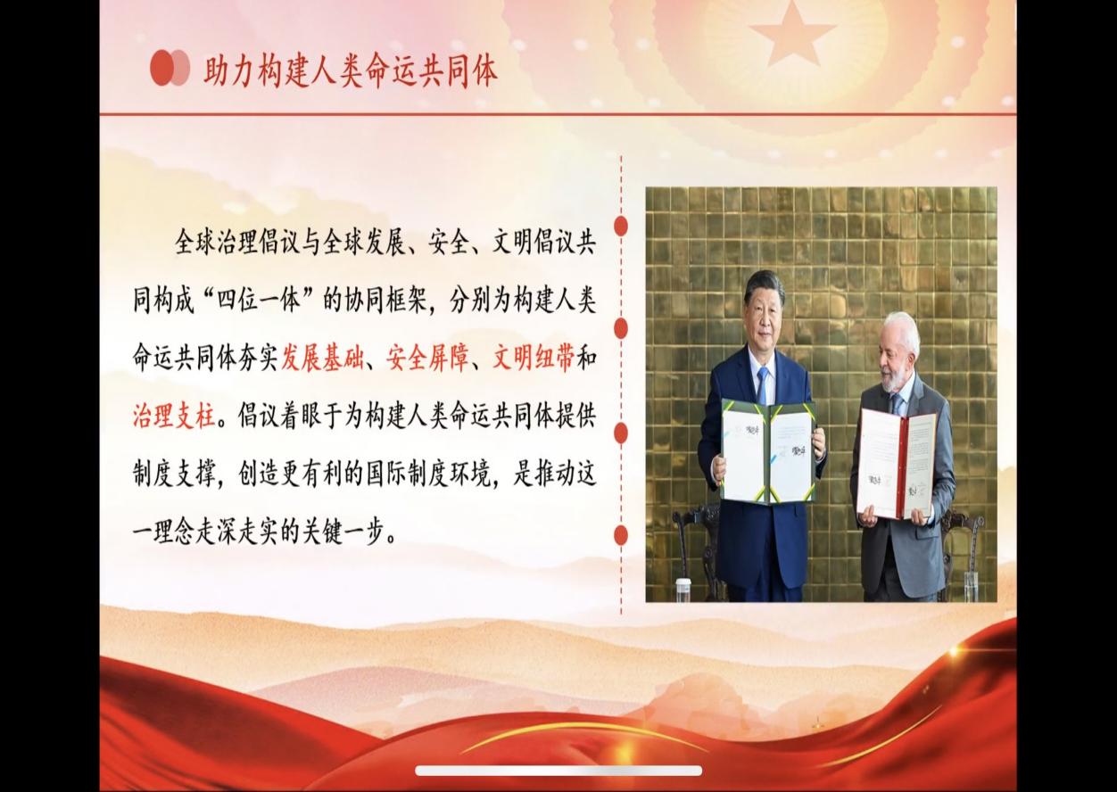 会议伊始,陈述焕讲明本次政治理论的学习主题,并将此次学习内容分为“捍卫公平正义,全球治理倡议的重大意义”“把握历史规律,全球治理倡议的丰富内涵”“引领共同未来,全球治理倡议的时代价值”三个部分。会议集中学习了习近平主席9月1日在“上海合作组织+”会议上郑重提出以奉行主权平等、遵守国际法治、践行多边主义、倡导以人为本、注重行动导向为核心理念的全球治理倡议。这一倡议是对中华优秀传统文化中“协和万邦”“天下为公”“知行合一”等思想的创造性转化和创新性发展,同时继承和发扬了和平共处五项原则等中国外交优良传统,并赋予马克思主义世界历史理论以新的时代内涵。