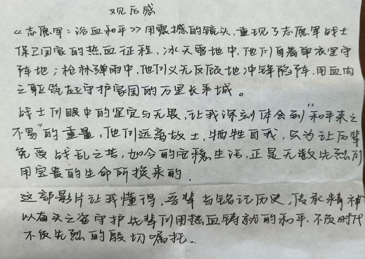 观影结束后,有些情绪还在胸腔里涌动,需要找一个出口。于是,学子们拿起笔,在纸上写下此刻的心绪。那些被光影触动的思考,那些对英烈的敬仰、对和平的珍视,渐渐沉淀成文字,也沉淀为一种持久的力量。书写,是一种诚实的面对。他们将内心的震颤与思绪交付给文字,不是为了祭奠,而是为了承接。那些源自烽火岁月的崇高情感,就这样在安静的笔尖下,沉淀为一种可以携带的、持久的力量。