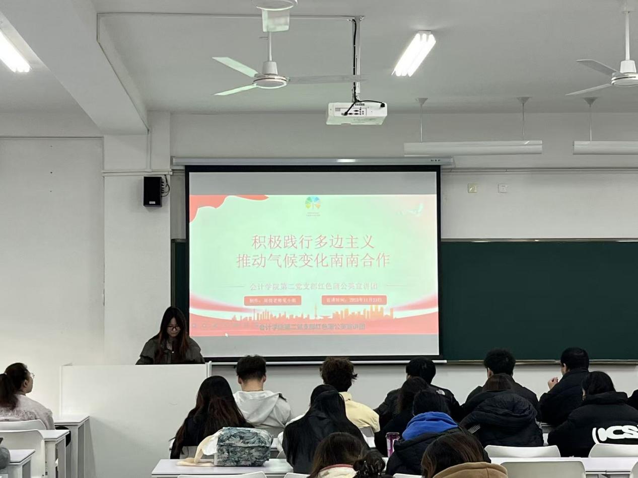共筑多边共识,同绘气候治理蓝图。11月23日,西南财经大学天府学院会计学院第二党支部学生党建办公室红色蒲公英宣讲团,在各班晚签到班会组织开展以“积极践行多边主义推动气候变化南南合作”为主题的宣讲活动。