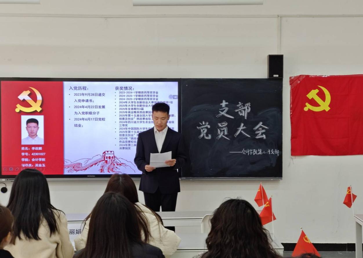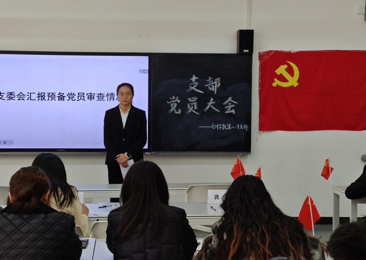 为严格规范党员发展程序,持续强化党组织建设,为党组织注入新鲜血液与蓬勃活力,2025年12月10日,西南财经大学天府学院会计学院第二党支部线下召开支部党员大会。本次会议聚焦发展党员与预备党员转正两大核心议题,支部党员、发展对象及相关预备党员参会。