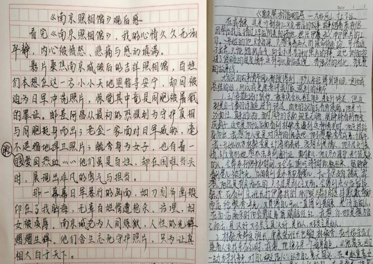 银幕渐亮,1937年的南京城徐徐浮现。昔日的六朝古都繁华尽失,沦陷于日军的铁蹄之下,成为血与火交织的人间炼狱,街头巷尾,无辜生命惨遭屠戮;断壁残垣间,妇孺老弱仓皇逃难。短短六周,三十余万同胞罹难,山河破碎,天地同悲。影片依据真实史料,再现那段黑暗岁月——城墙下堆积如山的遗体、废墟中奄奄一息的呼救、仁人志士不屈的脊梁,每一帧画面都沉重叩击人心。随着影片情节推进,时而能听到低声啜泣,时而又见紧握的拳头轻轻颤动。这不仅仅是一次视觉的触动,更是一场直抵心灵的精神洗礼。影片结束后,参与学生纷纷撰写观后感,将观影时的震撼与感悟诉诸笔端,让历史记忆在文字中扎根,让青春担当在思考中生长。