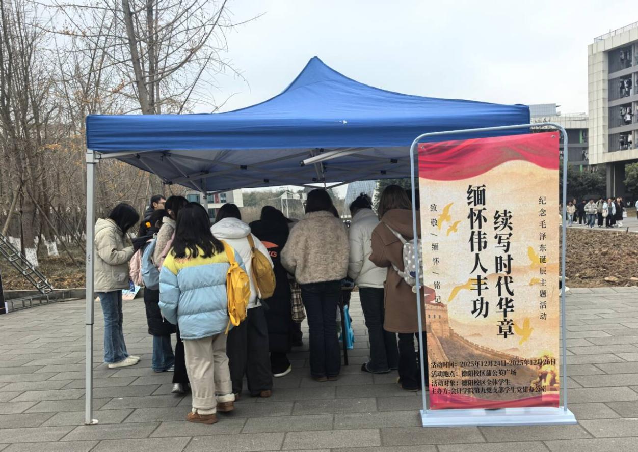 霜染冬枝忆伟绩,薪火相传向未来。为深切缅怀毛泽东同志的历史功勋与精神风范,厚植青年爱国情怀与使命担当,德阳校区会计学院第九党支部学生党建办公室于2025年12月26日,在蒲公英广场举办“缅怀伟人丰功,续写时代华章”纪念毛泽东同志诞辰132周年主题活动。