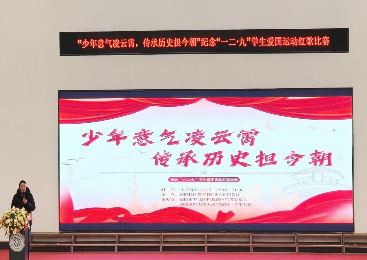 为纪念“一二·九”学生爱国运动九十周年,传承红色基因,激发天府学子的爱国情怀与责任担当,12月8日晚,由德阳市罗江区科教新区管理委员会与西南财经大学天府学院德阳校区第一学生社区联合举办的“少年意气凌云霄,传承历史担今朝”纪念“一二·九”学生爱国运动红歌比赛在德阳校区C203报告厅开展。会计学院党委副书记孟仁丹及会计学院全体辅导员共同参与,在歌声中回溯历史,凝聚青春力量。
