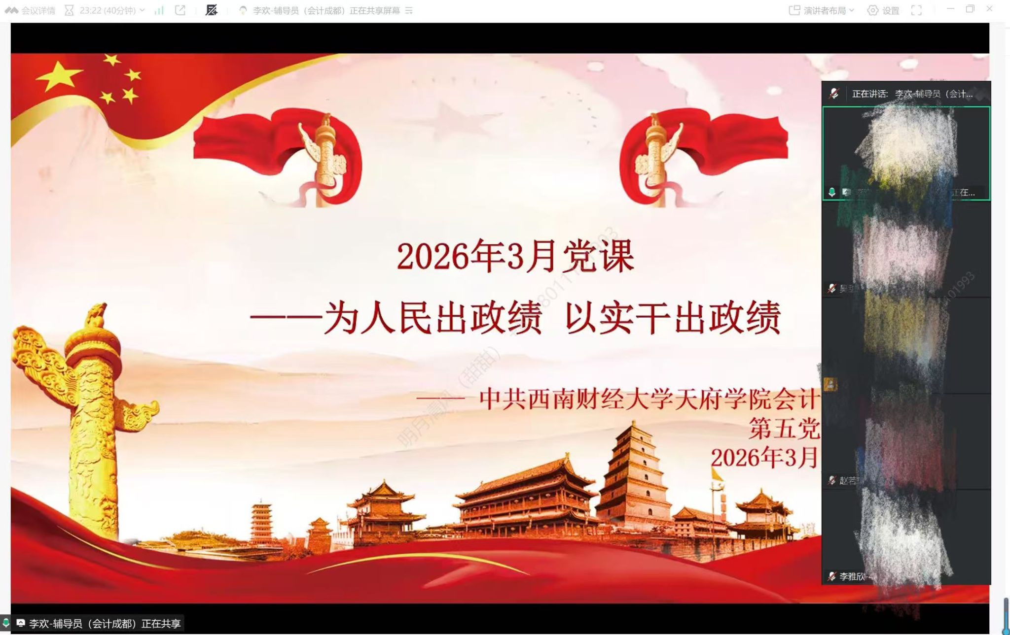 为深入学习贯彻习近平总书记关于树立和践行正确政绩观的重要论述,3 月 20 日,会计学院第四、五、六、七、八党支部同步开展以“为人民出政绩 以实干出政绩”为主题的专题党课学习。各党支部书记主持会议,全体党员参加学习。