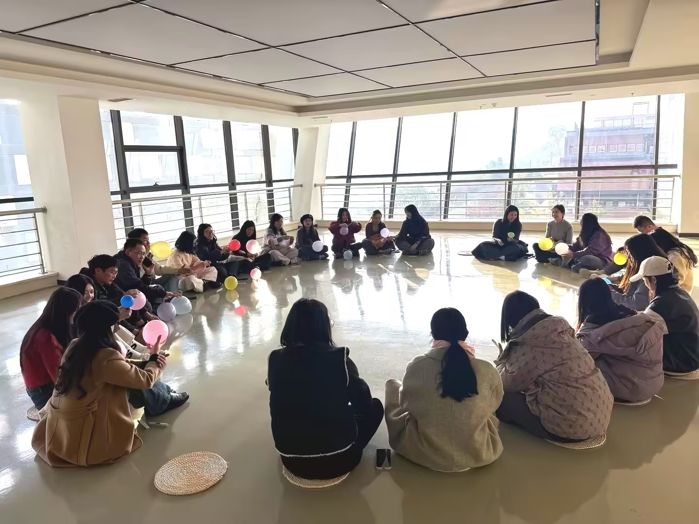 活动现场氛围轻松愉悦,大家围坐成圈,依次开展了踩气球、眼色游戏等趣味互动。在踩气球环节,彩色气球在欢声笑语中被轻轻踩破,清脆的声响里满是欢乐;眼色游戏中,大家凭借默契的眼神传递信息,现场不时响起默契达成后的喝彩声。