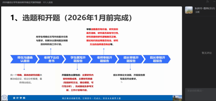 其次,流程规范方面。阮秋玲详细解读了2026届会计学专业本科毕业论文指导的工作流程及各环节质量标准。选题与开题阶段,要求选题需结合专业特点,注重理论与实践融合,开题报告需经过三级审核,确保选题的学术性和可行性;写作阶段,指导教师应督促学生严格按照学术规范撰写,注重文献参考比例,通过中期检查把控写作进度和质量;评审与答辩环节,明确重复率与答辩资格直接挂钩以及答辩的三种结论具体后续指导流程。