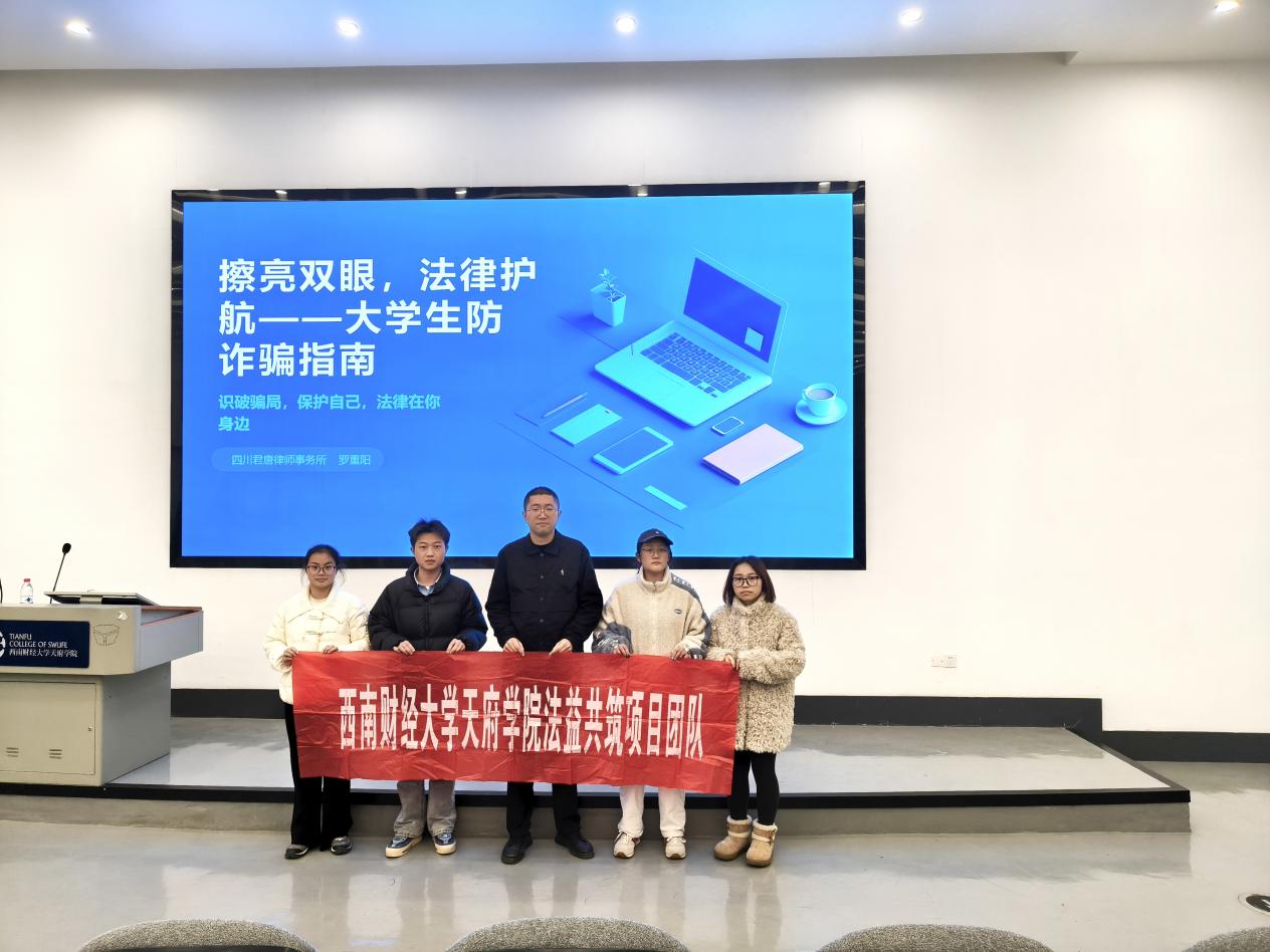为提升师生法治意识,12月25日,会计学院特邀四川君唐律师事务所执业律师罗重阳开展主题为“擦亮双眼,法律护航-大学生防诈骗指南”的专题讲座。本次活动由法益共筑项目团队与法学社联合举办,会计学院师生代表100余人参与了本次讲座。