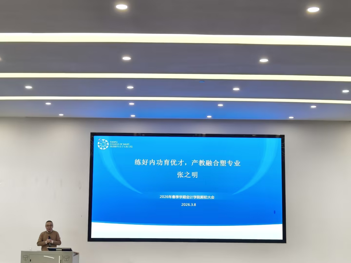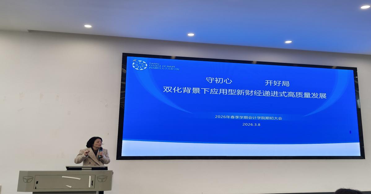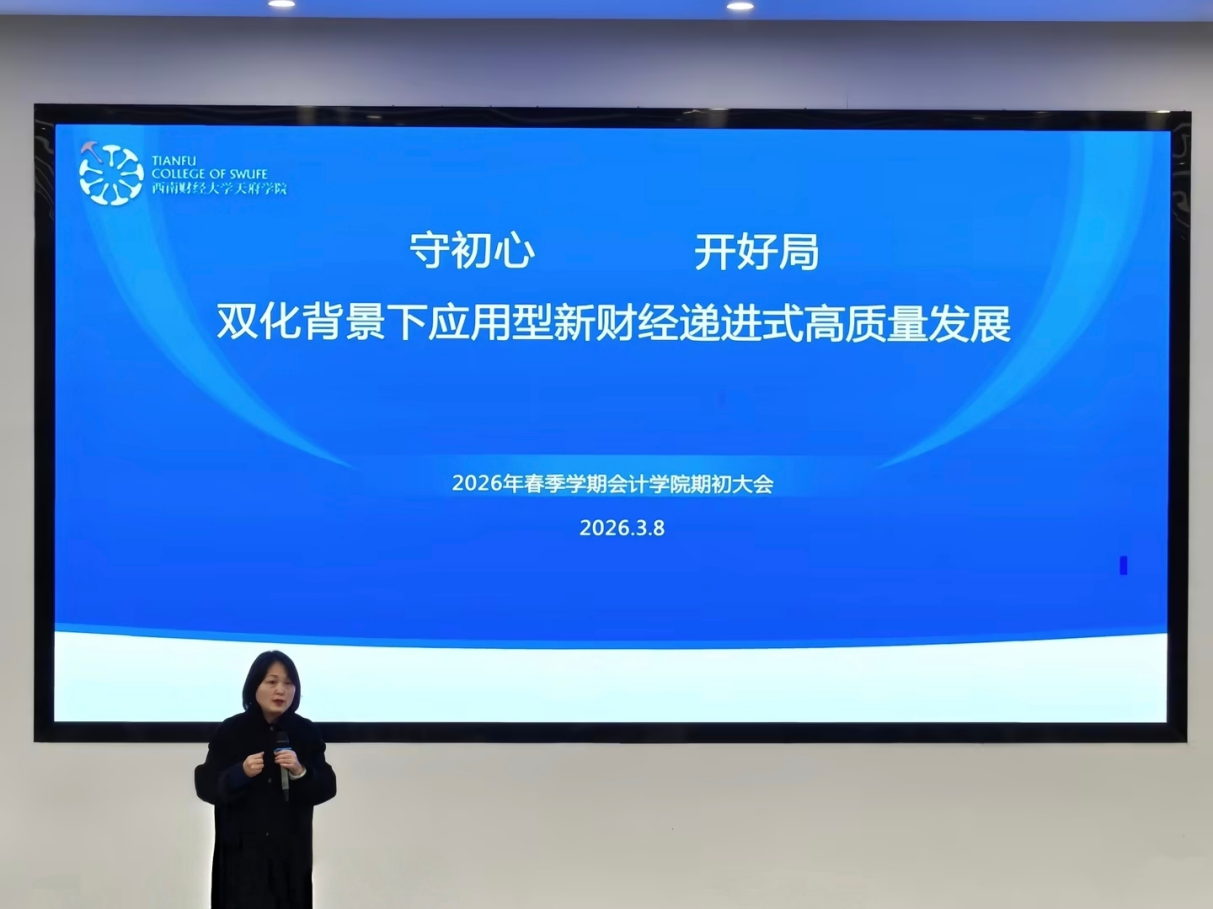 3月8日上午,会计学院2026年春季学期期初全体教职工会议在德阳校区B301报告厅举行。会议围绕“守初心,开好局——双化背景下应用型新财经递进式高质量发展”主题,全面回顾过往成绩,精心擘画新学期发展路径。西南财经大学天府学院副校长张之明、校长助理高亮,四川省经济学与财政学教学指导委员会秘书长、西南财经大学财税学院刘蓉教授应邀出席会议,会计学院院长陈真子主持会议。