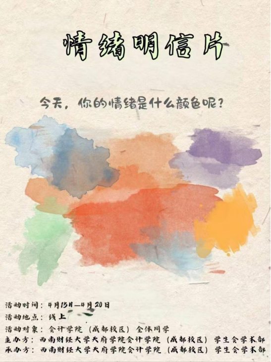 在青春的旅程中,情绪如同多变的天气,时而阳光灿烂,时而阴雨绵绵。为了给同学们搭建一个抒发情绪的平台,帮助大家更好地进行情绪自我调节,促进人际间的情感共鸣,西南财经大学天府学院会计学院(成都校区)学生会学术部精心策划并成功举办了“情绪明信片——心灵调色盘行动”。此次活动于2025年4月15日至4月20日在线上展开,面向会计学院(成都校区...