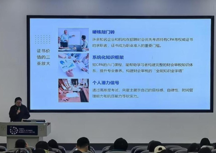 帮助学生理清证书备考思路,高效规划技能提升路径,2025年12月9日晚,由会计学院班主任秘书处联合团总支、学生会学术部共同举办的“班主任领航系列”讲座在德阳校区B101报告厅顺利开展。本次讲座以“技能证书规划攻略”为主题,特邀会计学院2024级专大数据会计14班班主任、会计系教师魏韦华担任主讲,德阳校区大一至大三约240名学生积极参与。讲座现场...